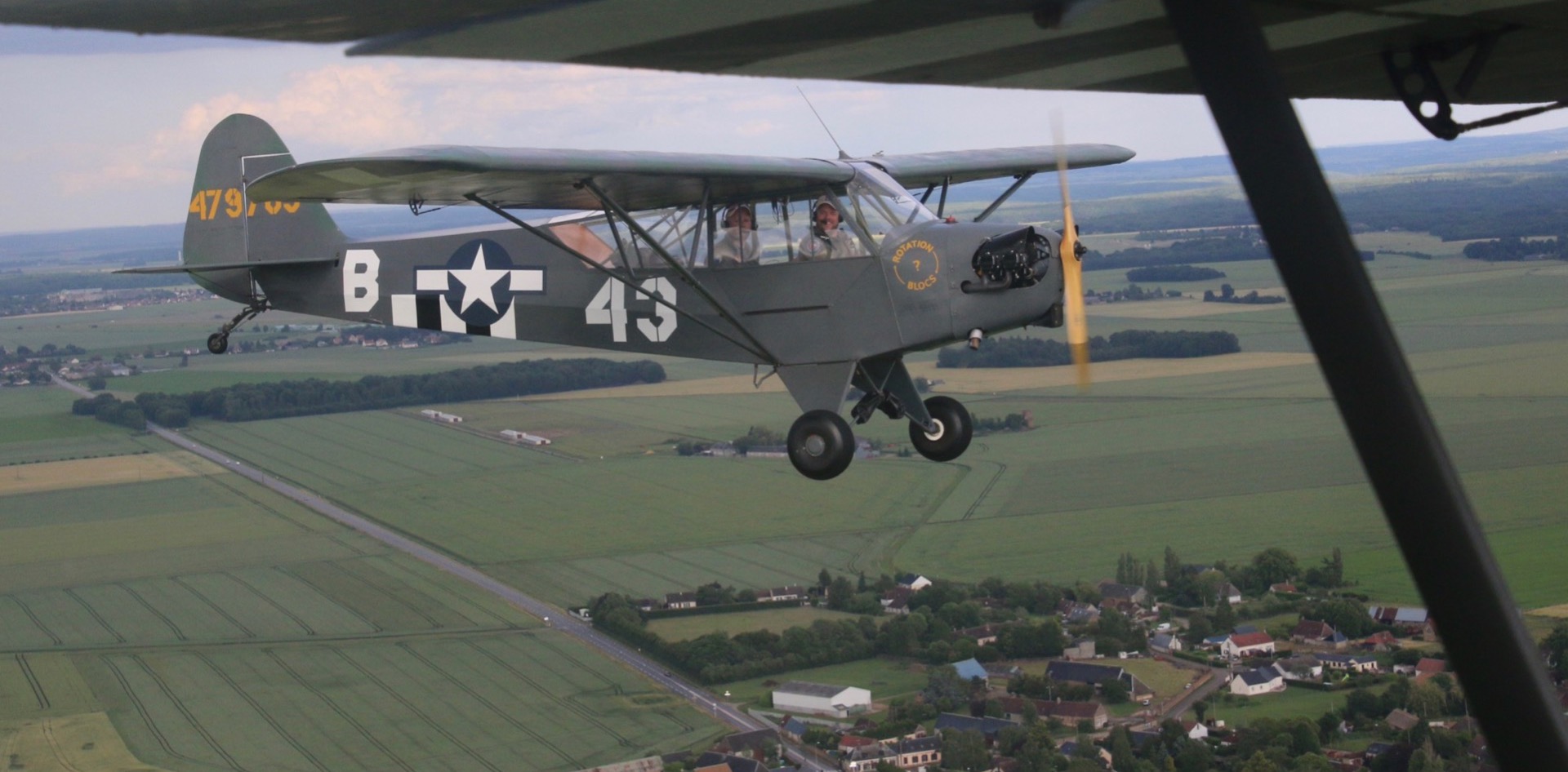 Early June 6, 2019, our Piper L4 Cub (N29EG) flew to Normandy France from our home base Hoogeveen for the 75th anniversary of D-Day. Our 1944 L4 Cub actually flew 75 years ago on June 7, 1944 from Omaha beach for our freedom in Europe. An event was organized at St. Andre de l'Eure airport was a total of 75 of these types of aircraft came together. This is unique because it did not occur after the war. These aircraft flew to Normandy from all over Europe.
